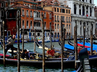 The Rialto Bridge and its environs also have gorgeous views of the Grand Canal.  The Canal cuts through Venice in an S shape & this bridge is right by one of the turns in the Canal.  The Canal in this area is lined with palazzos, cafes & docks with tall wooden boat mooring columns, and the water is filled with gondolas and other boats.