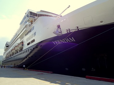 With two sea days until our first port I thought I would show you a bit of the Veendam. This is our first trip on a Holland America ship other than Prinsendam and also our first that isn’t a Grand Voyage. Veendam is about half again as big as Prinsendam (capacity of around 1350 passengers) but the ship itself doesn’t seem all that much bigger. In the picture below, our cabin is located on the deck below the lifeboats at the back of the last orange lifeboat.