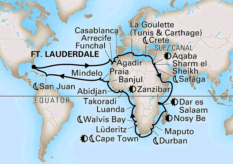 Welcome to Bader Journal, the travel blog of Rick & Mary Bader. That’s us, pictured at the top, in old travel pictures that will rotate randomly each time you open the blog, but have nothing to do with the content of the post appearing below them. This blog was created primarily for our family & friends but anyone who is interested is welcome to view it. We last set sail October 10, 2022 on a 71 day circumnavigation of Africa on the Holland America ship Zaandam. Here is a map of our itinerary: