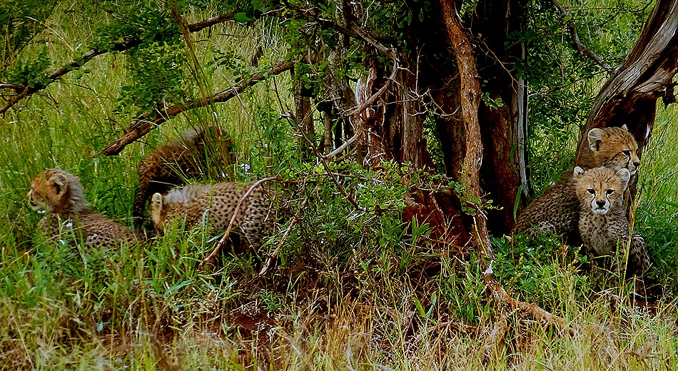 We found another family of cheetahs, the supposedly elusive species we have now seen for the second time in two days. This time it was a mother with four or five cubs, but the cubs were a bit older & bigger than the ones we saw yesterday. Cheetahs are an endangered species with only about 7,000 left, a majority in South Africa. Lions and other big cats prey on their young so that only about 5% live to 2 years, which is about when they can go out on their own. Cheetahs are also the fastest land animals in the world, capable of 60 to 70 mph in short bursts. It is hard to tell the adult from the cubs unless they are in a picture together, so we will make our best guesses about that.
