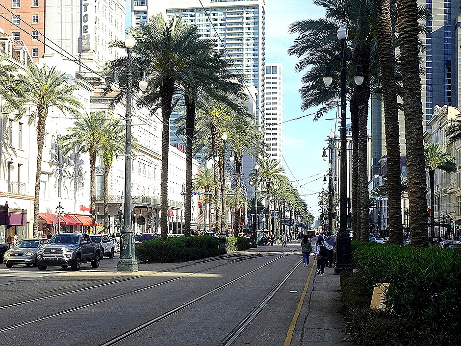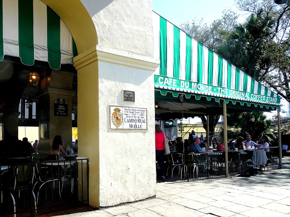 We stopped for café au lait and beignets at the Café du Monde in the French Market. In operation since 1862, this awning covered patio is a favored tourist attraction these days. When we have been here before waitresses served the tables with coffee and beignets on ceramic plates and cups, but that is now gone. We sat down expecting the usual waitress but none materialized, then we noticed the line of people waiting to ;purchase their food at the back of the patio. Joining the line, we obtained coffee in paper cups and beignets in a paper bag and sat down at a table. For those who don’t know, the coffee here is laced with chicory which alters the flavor noticeably. Beignets are hole-free donuts covered in a thick layer of powdered sugar, most of which we brushed off before removing them from the bag. They are really tasty.