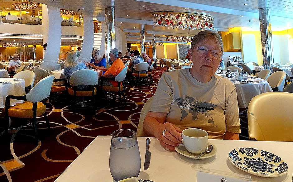 We ate most of our dinners, and breakfasts on sea days, in the Main Dining Room, which had unusual curved pillars holding up the second floor. During the first leg of our back-to-back we had a table upstairs by the rail, but there were several hundred fewer passengers on the second leg so they closed the upstairs and everyone had to be seated downstairs. Presty, who many of you may know from world cruises, was the dining room manager. He recognized our faces right away and was very solicitous, arranging a table by the windows for us when we were moved downstairs. We had arranged to share a table with our world cruise tablemates Bob & Judy, and were most disappointed when a non-Covid medical issue made them miss our cruise at almost the last minute.