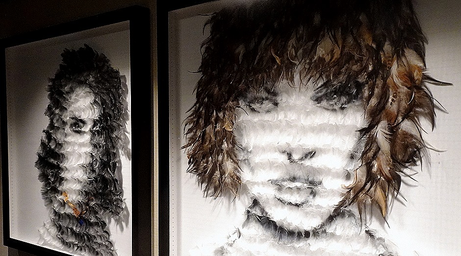 There were some artworks on walls composed of unusual media. A copy of Vincent Van Gogh’s Starry Night on a stairway landing turns out, when viewed up close, to be made of small plastic toys and other items, and a portrait of Van Gogh was similarly made. Some soft stripey portraits of women turn out on closer inspection to be painted on feathers. There was also an elaborate painting in a classical style on a surf board.
