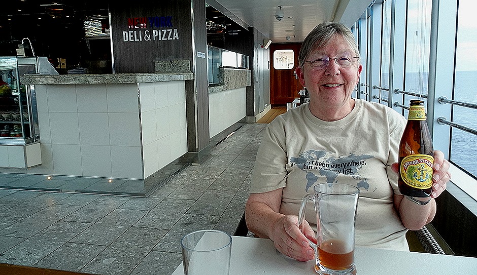 Many of the spaces on this ship are similar to other HAL ships we have been on, only bigger. The atrium is lighted in purple and has no multistory central sculpture. The crow’s nest has the usual shipwide array of front facing windows, but it also houses the shore excursion folks and a couple of interactive displays about the ports and sea routes. There is also a section with some books (nothing like the old libraries HAL used to have), puzzles and games. The lido pool area has two floors of seating and some casual restaurants with a huge video screen at one end of the pool. We spent a lot of time in this area reading, with our mp3 players plugged into our ears to blot out the ship’s continual soundtrack.