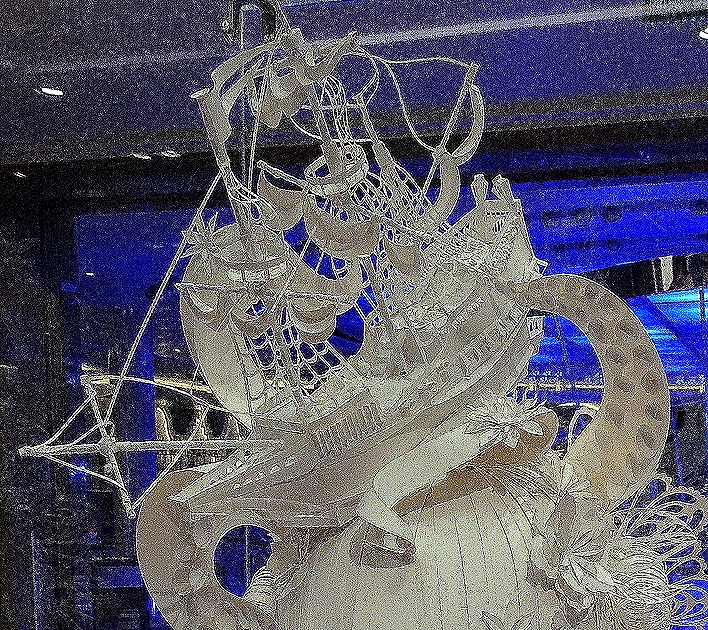 Near the atrium was a sculpture of a lady’s head with a very elaborate hairdo topped by a sailing ship apparently under attack by a giant squid. And near some elevators was large copy of Michelangelo’s David made of glass (or possibly plastic). If you look closely in his lowered hand is an iphone with which he is taking a selfie. Quite unusual.