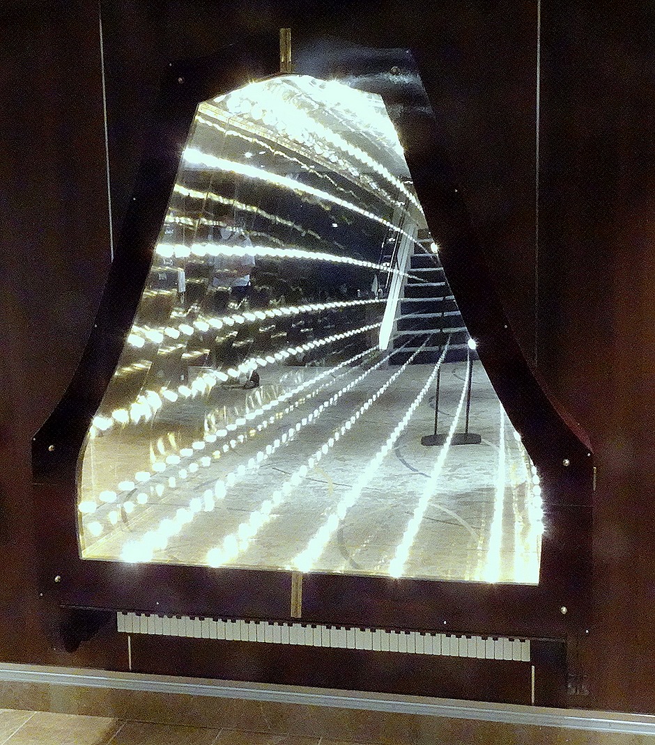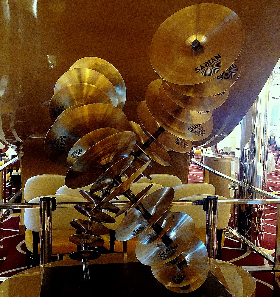As on other HAL ships, there is a lot of art scattered around the Nieuw Statendam. But while other ships we have been on have antique or classic looking artworks from around the world, this ship’s collection leans heavily toward the pop art genre. The ship has something of a musical theme, though it is not overdone. For example, some of the hallway carpets have images of musical instruments woven in along one wall. Among the musically themed art were a portrait of Jimi Hendrix, a reflective infinity piano hanging in an elevator bay, a melting guitar sculpture by the elevators on another floor, a sculpture made of cymbals in the front of the Main Dining room, and two huge violin hangings covered in what looked like Delft ware on the wall behind the front desk.