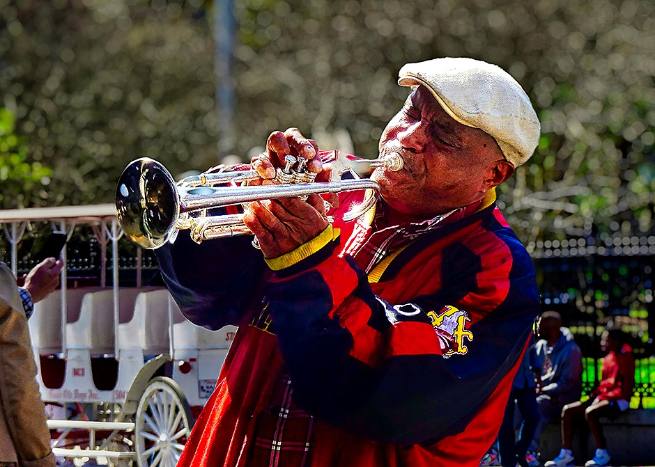 After visiting the waterfront and some art galleries we began walking back toward our hotel. In Jackson Square (named for an equestrian statue of Andrew Jackson, the winning general in the 1814 Battle of New Orleans) we came across a larger brass band, complete with Sousaphone (tuba). Very colorful and very engaging music.