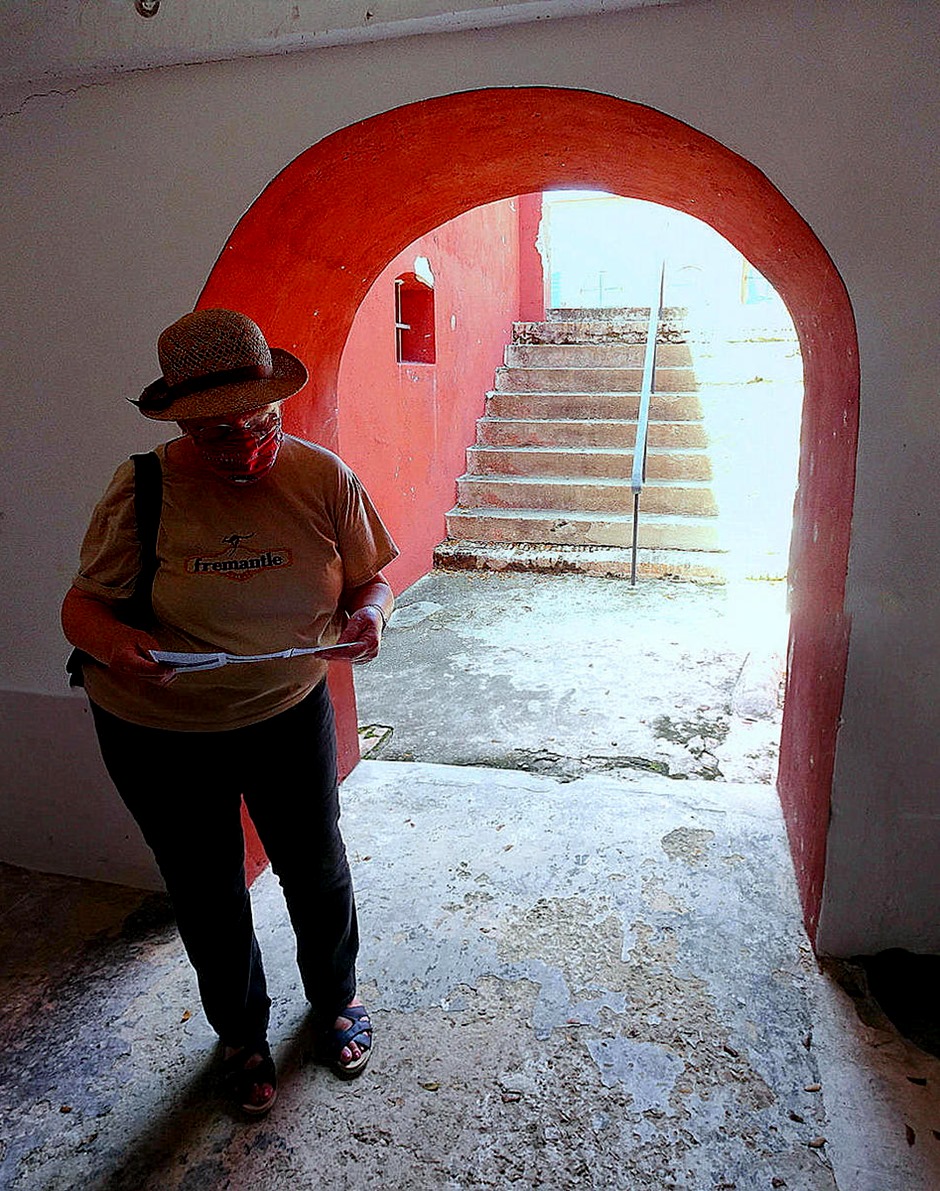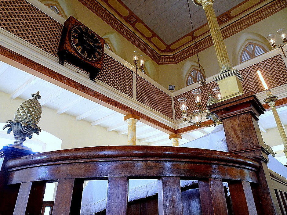 By happenstance, we arrived shorty before a tour conducted by a member of the congregation was scheduled to begin. We were invited to join and were very glad we agreed to do so because we learned much more than we would have walking around on our own. It started in the main sanctuary of the synagogue, just inside the door in the picture above, where our guide explained the history of the synagogue and the Jewish community of Barbados. Only a few items are original to the old synagogue, notably the clock on the front of the women’s balcony above the bimah and the ark holding the Torahs (notable because those are the items I still remember). For a transplanted American who retired here only a few years ago our guide was extremely knowledgeable.