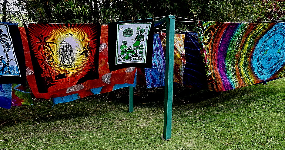 On the grounds is Caribelle Batik, where beautiful wax-resist dyed cloth is created and made into colorful clothing and other items, all of which are for sale in their shop. We watched as this process was applied to cloth by a woman who was very much in charge: each time someone entered without a mask she stopped working and instructed them in no uncertain terms to put one on. We wished that were done more often in crowded public spaces in the Caribbean. The cloth is hung outside to dry. Their products are not cheap, but are excellent quality. Mary purchased a batik Covid mask while we were there.