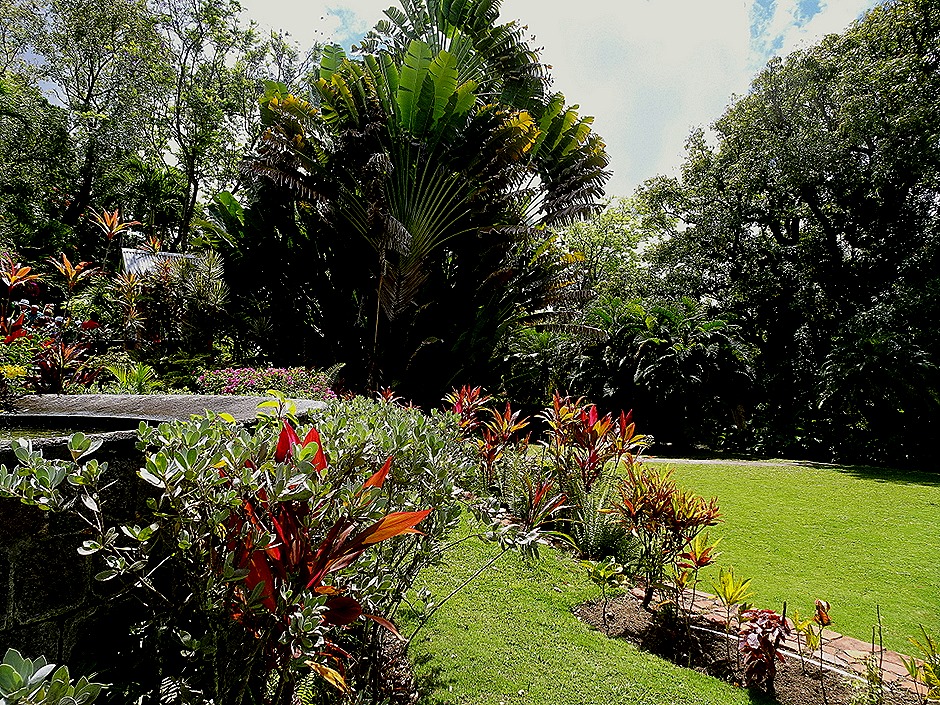 Our next stop was the pleasant Botanic Gardens. Begun in the 1890’s, the gardens were recognized as the best in the West Indies. In 1979, however, Hurricane David destroyed a number of the old trees. A beobab tree fell on an empty school bus parked there, smashing it. The bus is still there, with the tree having grown a second trunk over it. There are other trees, including palms, bamboo and a banyan, as well as flowers and shrubs with colorful leaves. We were told the names of all of them, but the captions on these pictures only include the names I can remember (hover mouse to see caption).