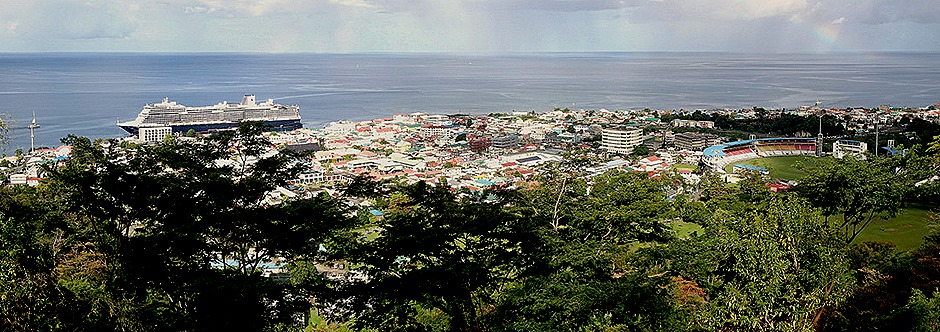 Fortunately for us, though, this ban was inapplicable to ship sponsored excursions and we were booked on one. After boarding the bus we had a quick panoramic (ie only on the bus) tour through the town of Roseau, then we drove up to Morne Bruce for a nice overlook of the city and harbor. There were gun emplacements here from the late 18th Century to the mid-19th. In addition to the city and the ship we had views of a cemetery and the soccer stadium.