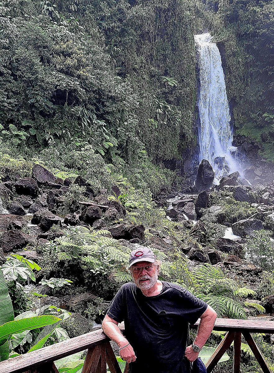 We stopped for a beer near the park then drove on to our last stop, also in the Trois Pitons park. The Emerald Pool is a 40 foot waterfall feeding into a pool of green water (colored by light through the trees and reflecting on the green plants around the pool). You can go swimming here but we didn’t. The walk in to the pool was pretty easy, downhill, but the walk back was steep enough that steps had been built into the path. Again, the walk took us through picturesque woodland. There were signs in the park reminding everyone of the pandemic and the rules to avoid it.