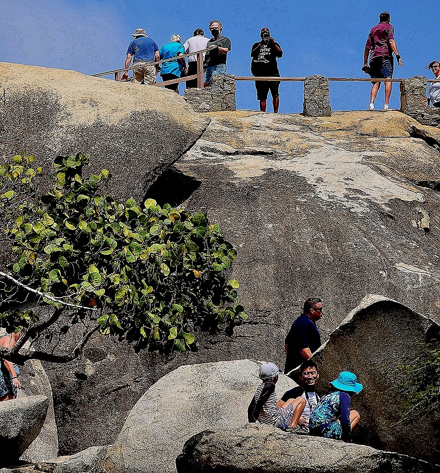 You may have noticed in one of the pictures above that people were on top of the large hill of boulders. In fact, two routes have been built for climbing to the top. Mary stayed below but Rick climbed to the top. The path on the side we were on went up through the rocks. At one point it seemed to come to an end well below the top & I (Rick) was about to go back down in defeat. Then I saw two teenage boys disappear into what looked like a cave in the rocks about ten feet before the end of the path. Following their lead, I found the path branched into the rocks. Climbing on some rocks was required and there wasn’t always sufficient head room to stand up, but ultimately this branch of the path emerged on the top of the hill. This provided panoramic views in every direction, including the Nieuw Statendam all the way back at the dock.