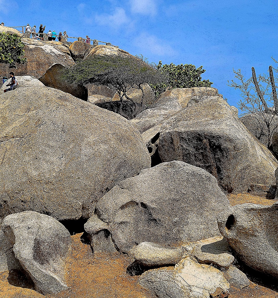As with Curacao we had never ventured beyond Oranjestad on our previous visits, so we decided on an excursion around the island. Our first stop was at the Casibari Rock Formations, a hill made of huge boulders in the middle of the island. The origin of this striking rock formation in a desert setting is unknown, and apparently the indigenous people who lived here considered it sacred. The rocks are surrounded by attractive garden areas. On the way there we passed an interesting cemetery with rows of above ground tombs. Behind it was Mount Hooiberg, a volcanic cone mountain rising straight up out of the desert, known locally as The Haystack