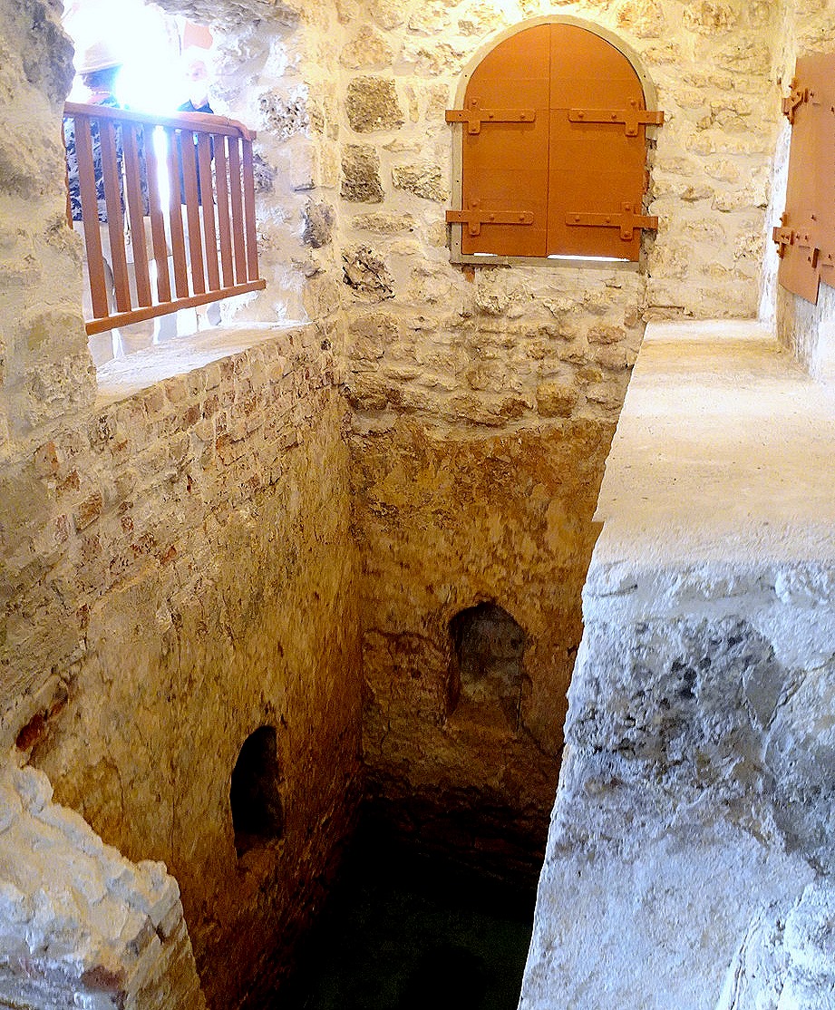 The entrance is under the clock tower on the side away from the water, so we walked around there and up a small hill to enter. The tower was originally round but was replaced with a clock tower over a new entrance in 1874.