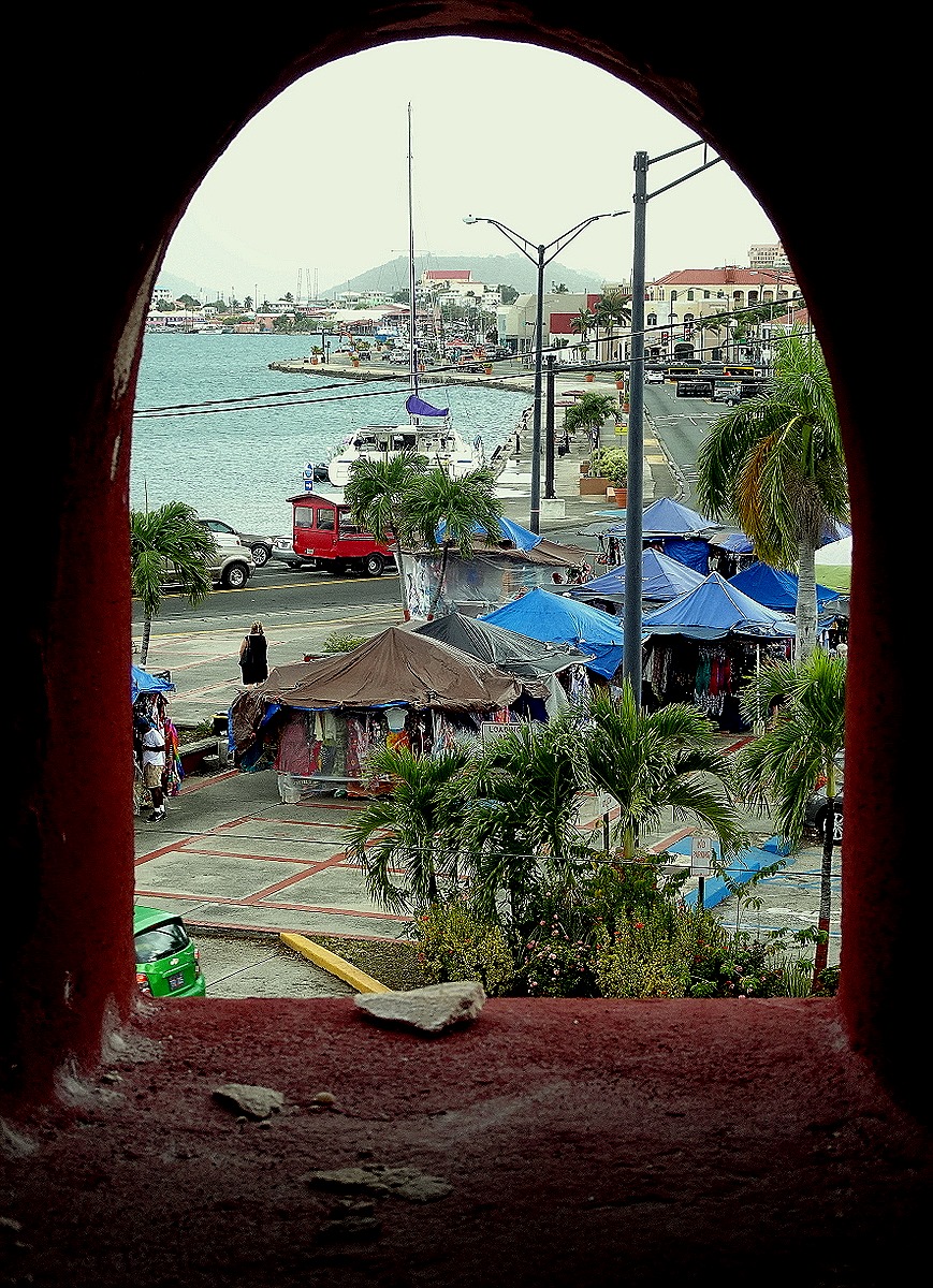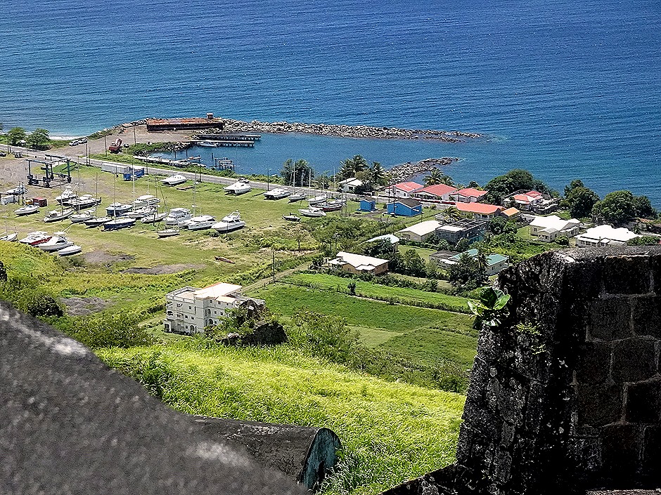 In the Citadel were a number of canon arrayed along the walls. To the northwest from one canon was a great view of the town of Sandy Point and the Dutch island of St Eustace in the sea beyond.