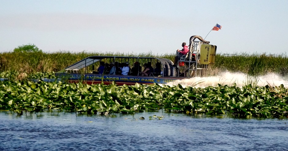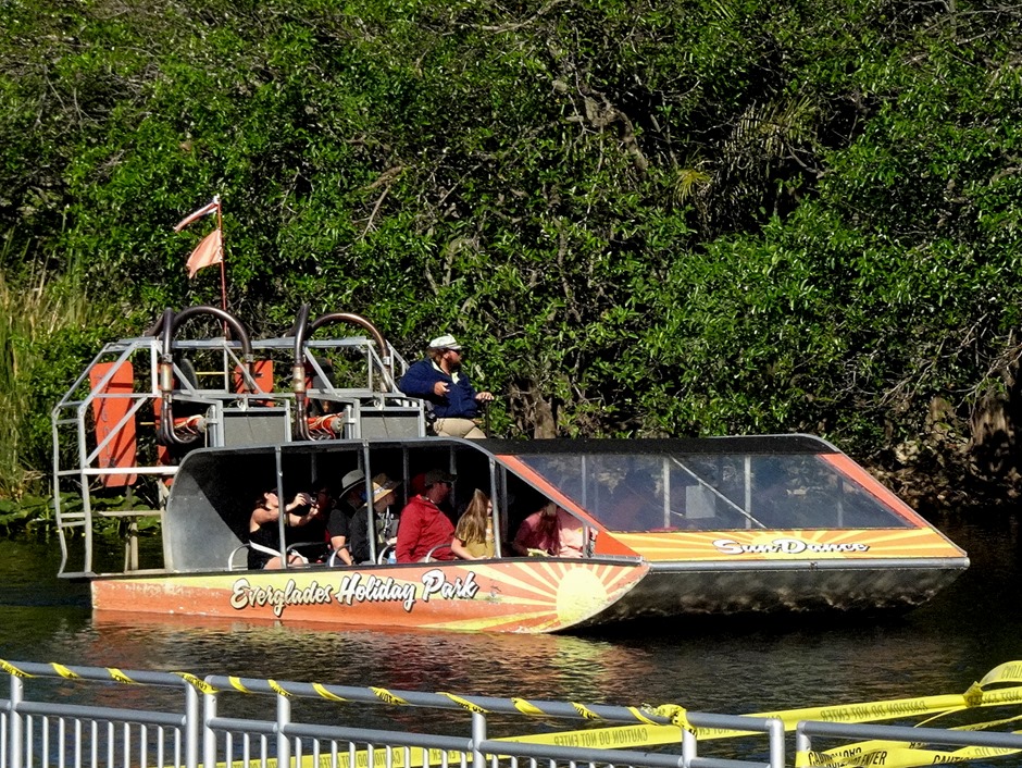We were bussed across the metropolitan area to a place called Everglades Holiday Park. Located on the edge of one of the Everglades canals, they provide rides in large airboats throughout the nearby canals. An airboat is a flat bottomed boat with one or two large fans or propellers mounted on the back. These fans blow air back from the boat, which propels the boat forward at speeds up to about 60 miles per hour. Mounting the propulsion system above the water ensures that it will not get tangled in the grass and other things growing below it.