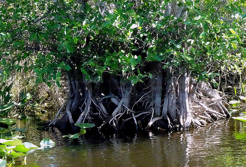 We went down a side canal that was lined with grass and very pretty trees growing in clumps with above ground roots reaching into the water, which we think are mangroves.