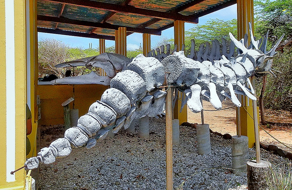 We stopped for a little while at the visitor center of Washington Slagbaai National Park, which lies beyond the lake and covers the northern fifth of the island. Again plenty of cactus and a few buildings. Most notable, though, was the skeleton of a 40 foot Bryde’s whale that was accidentally impaled on the prow of HAL’s Nieuw Amsterdam (not the current one) in 2000. The skeleton was reconstructed by a team of high school students and went on display here in 2005. It is the largest whale skeleton in the Caribbean.