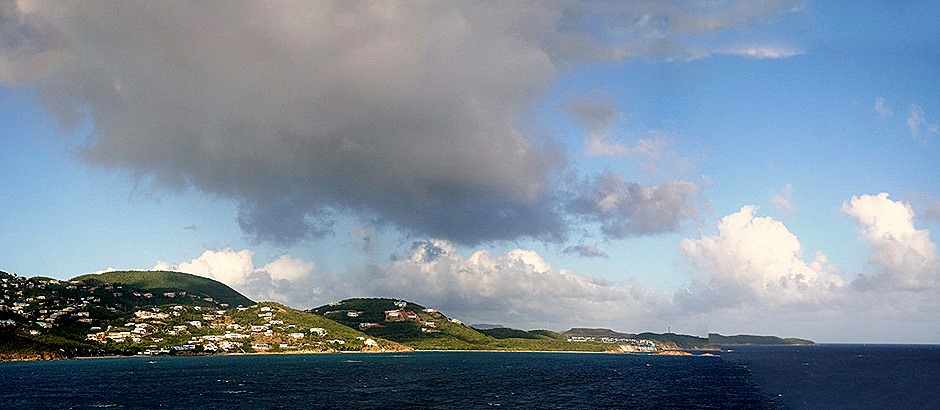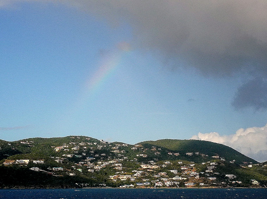 So in late afternoon we left our mooring and sailed across the harbor and out to sea. From our balcony we spotted Blackbeard’s Castle, a lookout on top of a hill built by the Danes in 1679 because Fort Christian’s location on the water did not give it a view of possibly hostile ships that might be approaching from a distance. On our first visit here we sat in a restaurant just under the Castle and had a leisurely beer while we watched seaplanes landing and taking off in the harbor below. It made for a really fine afternoon. Sadly, last time we were here the whole area around the Castle was enclosed and an admission fee was required to enter. Not an improvement. As we reached the end of the land there was a small rainbow to bid us farewell. Outside the port we passed a couple of islands as we headed out for a full sea day before our next stop, which was much appreciated after six consecutive days in different ports.