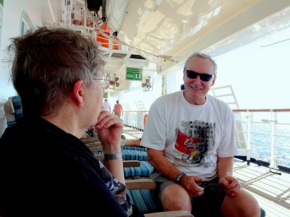 So finally, after three years of preparing and waiting and packing, it felt great to be on board.  Like everybody else on the ship we were vaccinated against Covid and for the first week (at least) everybody had to wear a mask inside when not eating.  We were rather nervous right up until we left home for the two day drive to Florida because we had to pass a monitored Covid test on Oct 7, within 3 days of boarding.  We had visions of receiving a positive result from our tests after driving a couple hundred miles south and having to turn around and spend the next 10 weeks at home after all.  But at 4:30 AM Saturday, about 5 hours before we left, we both received our negative test results and we were good to go.