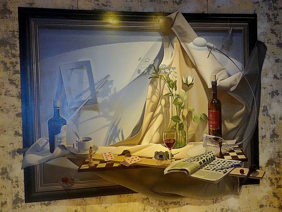 As I mentioned earlier, Zaandam is laid out just like Amsterdam, but with different furnishings and art works.  In the Atrium in the center of the ship is a three story pipe organ.  It was played one day in the first week but we were disappointed that it was just a recording (similar to a player piano we guess) with no one sitting at the keyboard.  Among a lot of other eclectic art around the ship are a couple of paintings overflowing their frames outside the main dining room, a floor to ceiling sized painting in the hall near the Explorations Café, and a sculpture of a couple of seahorses near the entrance from the deck just outside our cabin.  Several large MC Escher pictures were displayed on the walls of stairwell landings.  And almost qualifying as a work of art, we received a box of Grand Africa themed chocolates after the first “dressy night.”  (These are nights when men are expected to wear a tie & jacket to dinner, formerly called “formal nights,” then “gala nights”; no explanation for the name changes.)  Other shipboard pictures may show up in later episodes.