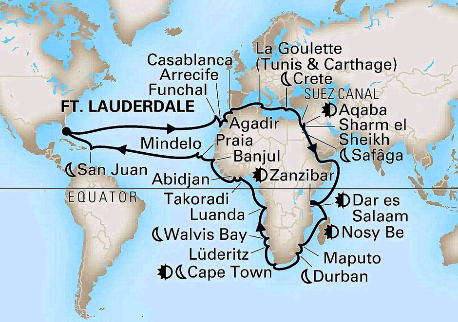 Here is our itinerary, in map form (half moon means late departure & a black half sun means a two day overnight stay) and then a list of the ports with arrival and departure times:
