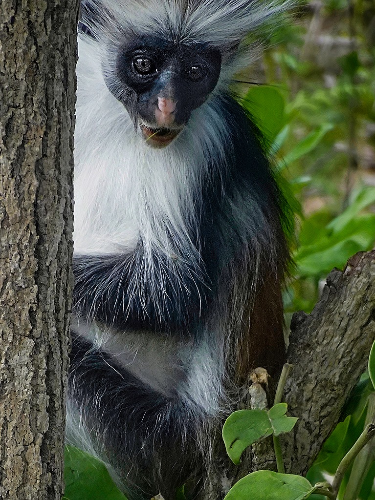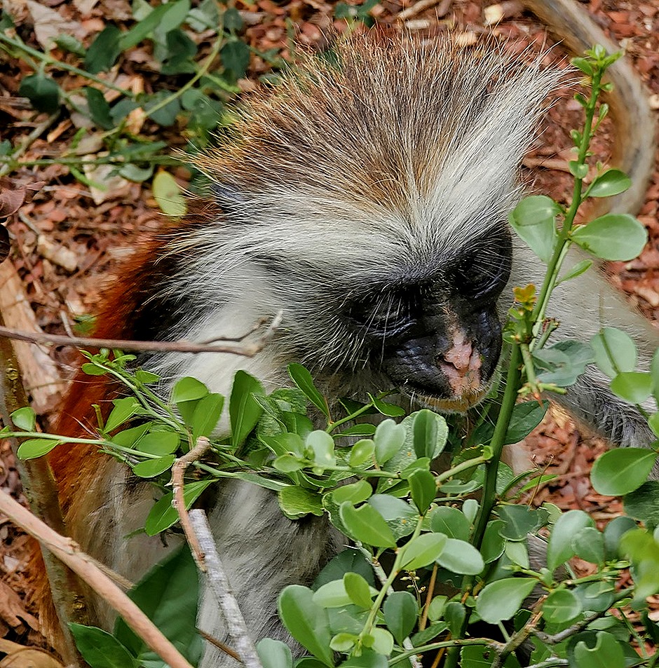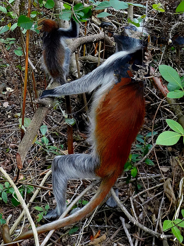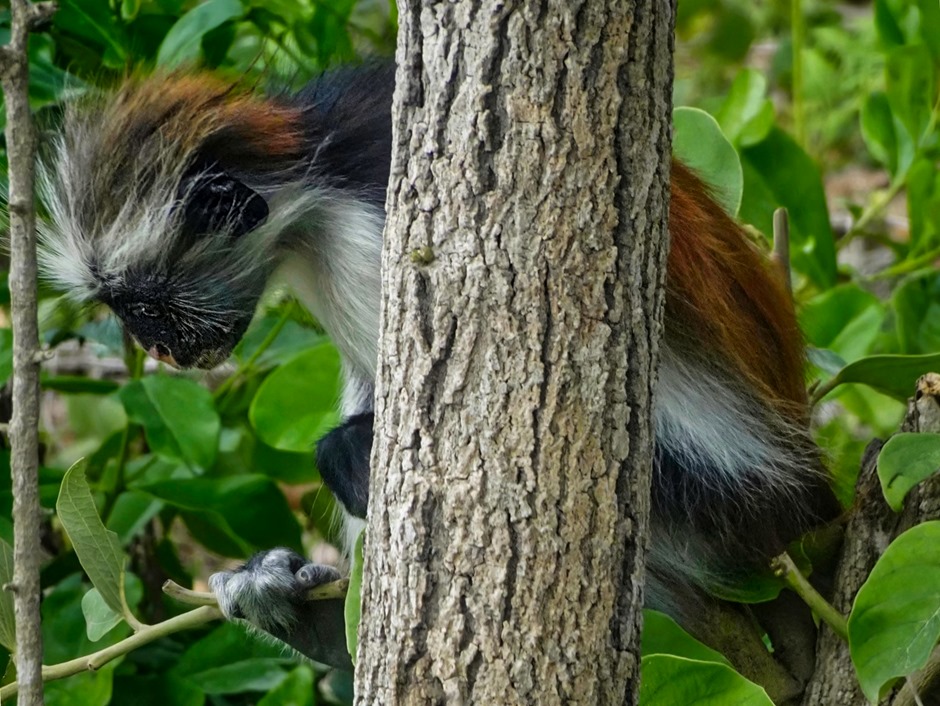 The Zanzibar Red Colobus Monkey is a species endemic to the Zanzibar archipelago. While there are other species of Red Colobus elsewhere in Africa the one living only in Zanzibar is considered the most endangered primate species in Africa. We have seen estimates of its total population between 1,000 and 3,000, but the first number seems closer. They live in trees and eat young leaves, flowers and unripe fruit. About half of them live in the Jozani forest. Apparently this species separated from others about 10,000 to 15,000 years ago when a rise in sea levels isolated them on these islands. Their name derives from the reddish brown color that covers most of their backs and the back of their heads.