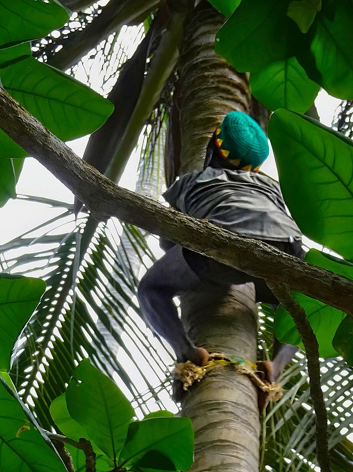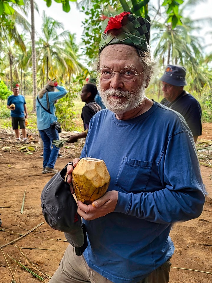 After lunch we were treated to a demonstration of cocoanut harvesting. A fellow tied his feet together and shimmied up a palm trunk, singing all the way. He was very good & very fast . . . I’m pretty certain we couldn’t do that.
