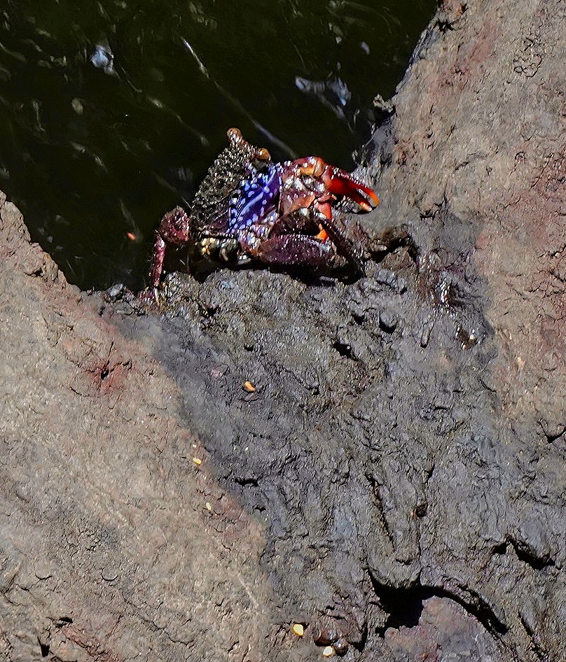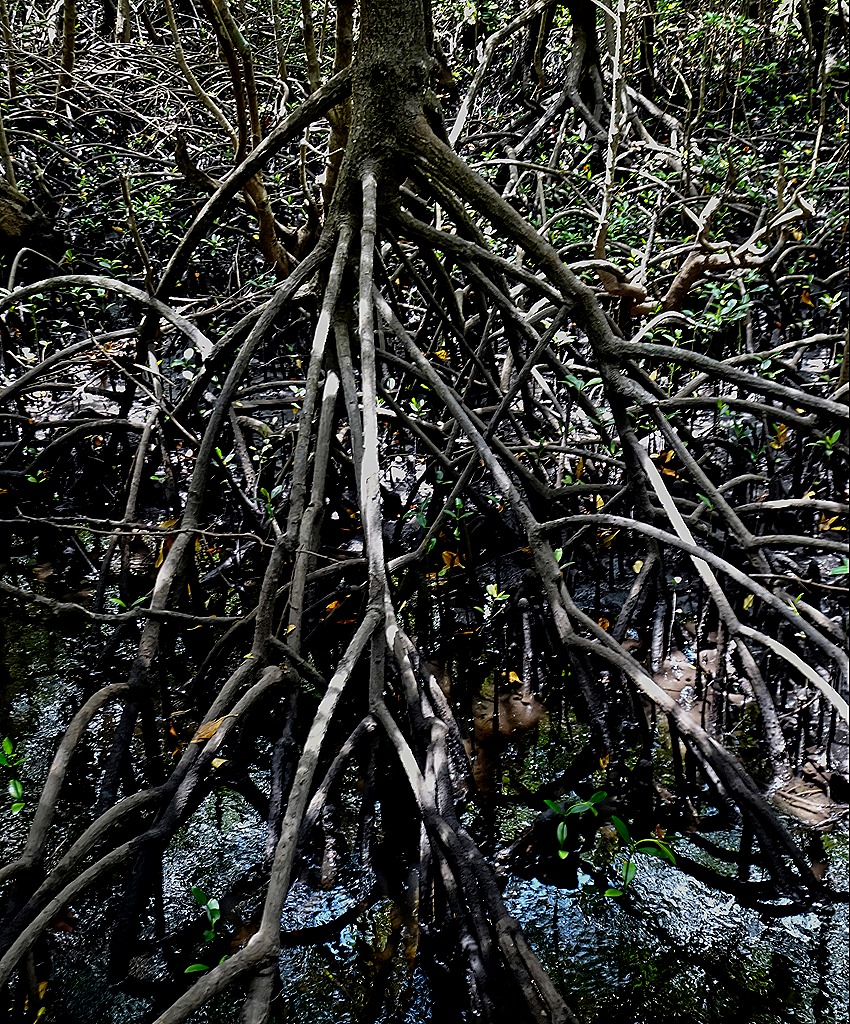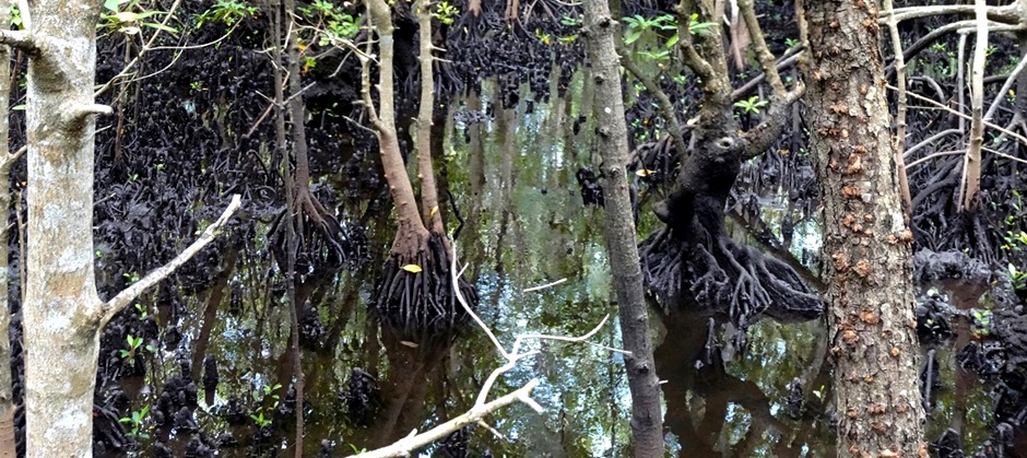Jozani also features a mangrove forest. It’s kind of swampy and dark but the root patterns are interesting, particularly when there are so many of them. Mangroves are valuable along the water’s edge where they help keep the banks from eroding and provide habitat for fish and small animals. I saw a red crab on a forked log in the water when I stepped onto a small wooden bridge but by the time I got the camera raised into position (maybe a second) it had scurried into the fork. Still visible, but less so, and it was so fast.