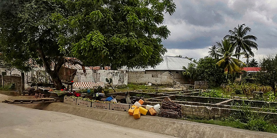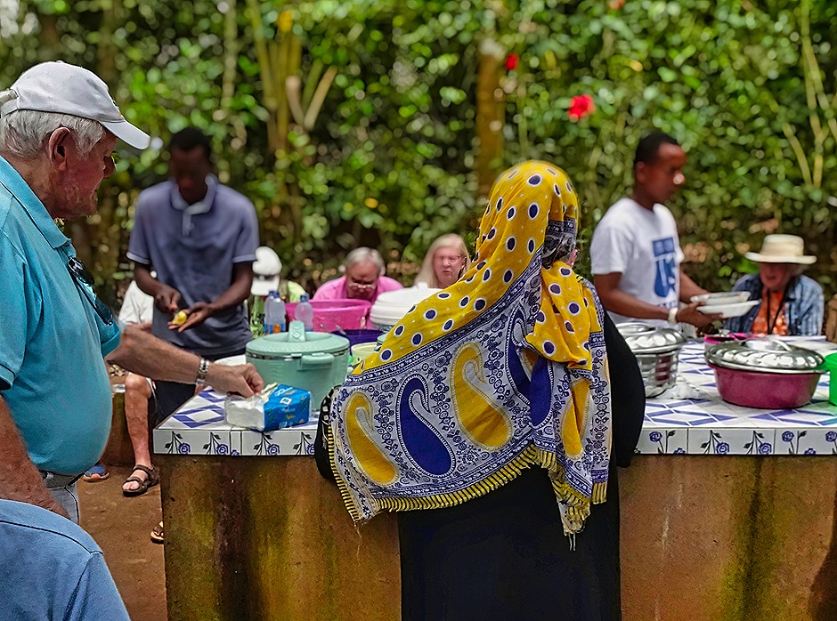 Zanzibar has long been known as a source of spices, especially cloves. At the Maganga Spice Farm we were given a tour of a number of different kinds of spice trees and also a lunch. We sat out in the open on long benches while the food was piled on tables, then brought to us by the farm’s personnel. We filled our plates with several kinds of local food, then discovered after eating all of it that there was much more to come, distributed in waves. The food was very good, particularly the ripe local fruit like mangoes and pineapple. In the yard where we were eating some chickens were looking for scraps (they undoubtedly have a lot of experience with groups like ours).