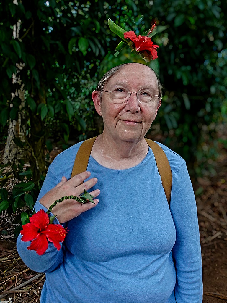After the demonstration we were all given hats woven from palm leaves with red flowers in them, different styles for men and women. Men were also given woven palm ties and women combination rings and bracelets. Very silly looking but fun anyway.