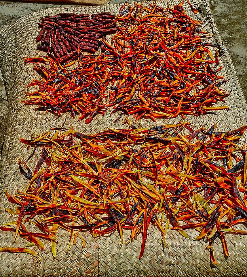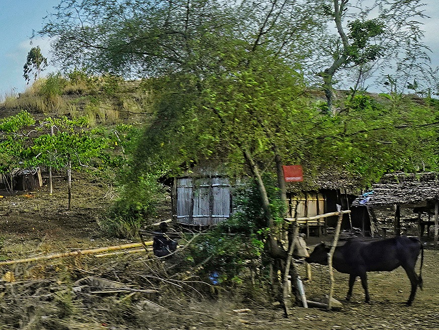 We piled into vans at the dock to begin the excursion, which included a number of lengthy drives over often unpaved roads littered with rocks. As you can imagine, it was a very bumpy ride. But these roads did take us into back country with a passing view of how people live here. We saw quite a lot of poverty and we have read since that they were in the midst of a two year famine. Not pretty, but real life. When we reached the village that was our first stop there was a fairly long walk past what looked like a farm on very uneven ground. They had geese (or ducks?) and what looked like red peppers drying in the sun on a table.
