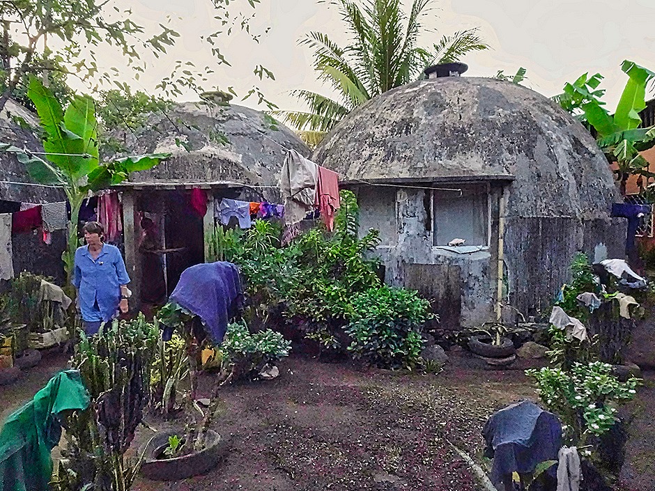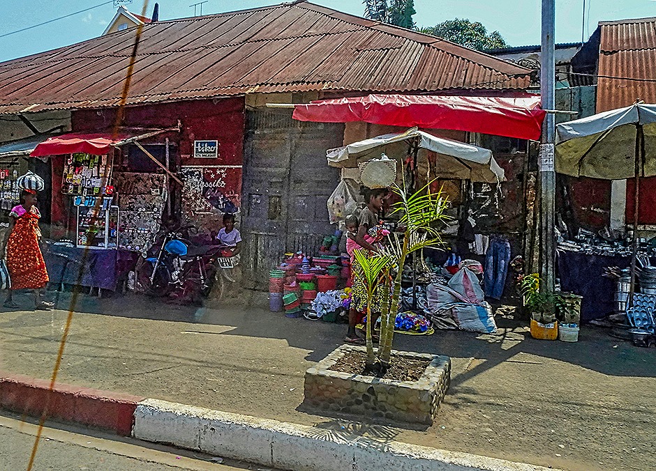 We drove down the mountain and along some roads to an ocean front town called Dzamandzar, the second largest city on Nosy Be with a population of about 19,000. We passed a number of rural scenes glowing in the setting sun. This city has somewhat famous balloon houses, which we stopped briefly to visit. It was rush hour and the traffic was slow and crowded. We had seen Dzamandzar in the distance from Mt Passot.