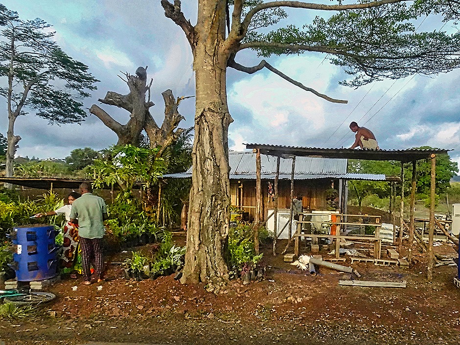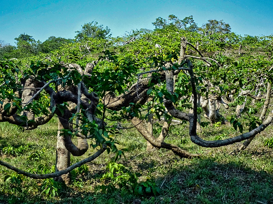 During the long drive on unpaved roads to our lunch spot we passed several ylang-ylang plantations. The aromatic oil from ylang-ylang flowers is widely used in perfumes and is an important export for Madagascar, where it is produced in great quantities. Because of this, Nosy Be has sometimes been known as Nosy Manitra (the scented island). Ylang-Ylang is a Spanish mispronunciation of a Tagalog term for “wilderness,” where these trees originally grew in the Philippines. This tree grows very fast, sometimes in excess of 20 feet per year, to an average height of about 40 feet. But in Madagascar the trees are heavily pruned, which keeps all the flowers within reach of harvesters on the ground and also stimulates the tree to produce more flowers. As a result the trees are very strange looking, close to the ground and wide spreading. Our guide picked a flower for us to see, but we did not get out of the van to examine the trees more closely.