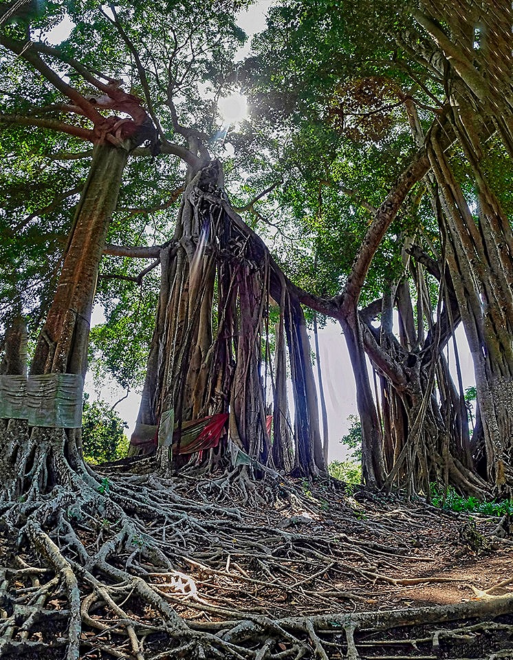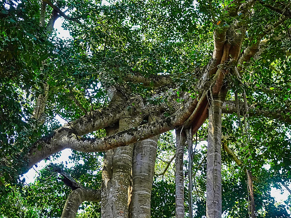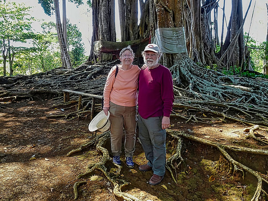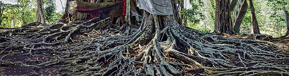 We stopped here to visit the sacred tree of Nosy Be (yes, that rhymes). Located near the coast by the small village of Mahatsinjo, this huge Banyan tree is said to have been planted in 1800 and was declared sacred by the Queen of the island in 1836. Even today the Queen of Nosy Be makes a sacrifice at this tree every year and several hundred pilgrims pray and leave offerings every month. Banyans are in the Ficus family (like the one you may have in your living room) and as you can see in the pictures they spread by sending new shoots down from branches to the ground, where they root and turn into additional trunks. We have read that lemurs live high in the branches of this tree but we didn’t see any. We think the cloths hung around some of the tree trunks may have been offerings. The tree’s root system is vast with many large and thick roots spreading over each other like a giant web that covers, we are told, some 5,000 square feet (or maybe it was meters).