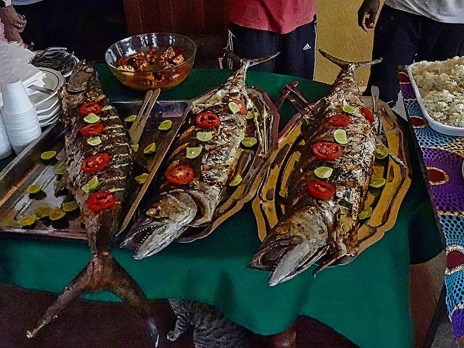 A fish lunch was set out on a buffet on the porch of the building where it was cooked (a restaurant? probably not in such a small place). We weren’t particularly hungry and the lunch was not included in the excursion so we sat on the porch and had a local Three Horses beer. There was a beautiful view of the beach and the bay from the thatch covered porch.