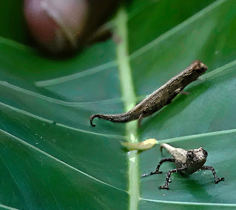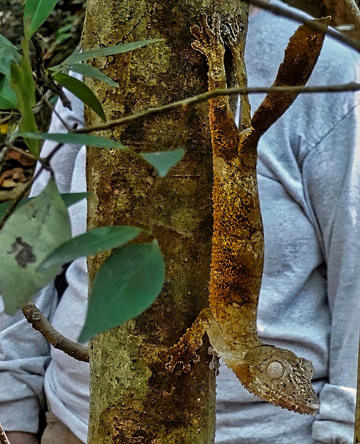 Lemurs are not the only interesting animals in this park. Almost half of the 200+ species of chameleons in the world are endemic to Madagascar. We saw two species of chameleon. One was relatively large, facing down on a tree trunk. He (or she) was so well camouflaged that even after it was pointed out by others Rick had trouble seeing it until moving to the side (possibly a gecko, but we think it was a chameleon). The others were very tiny, about the size of a thumbnail. One of our guides showed them to us on a leaf. A new species of chameleon was just discovered in 2021 called Brookesia Nana, which is the smallest reptile in the world. But it may also have been Brookesia minima, which is the third smallest reptile in the world and is common in these parts.
