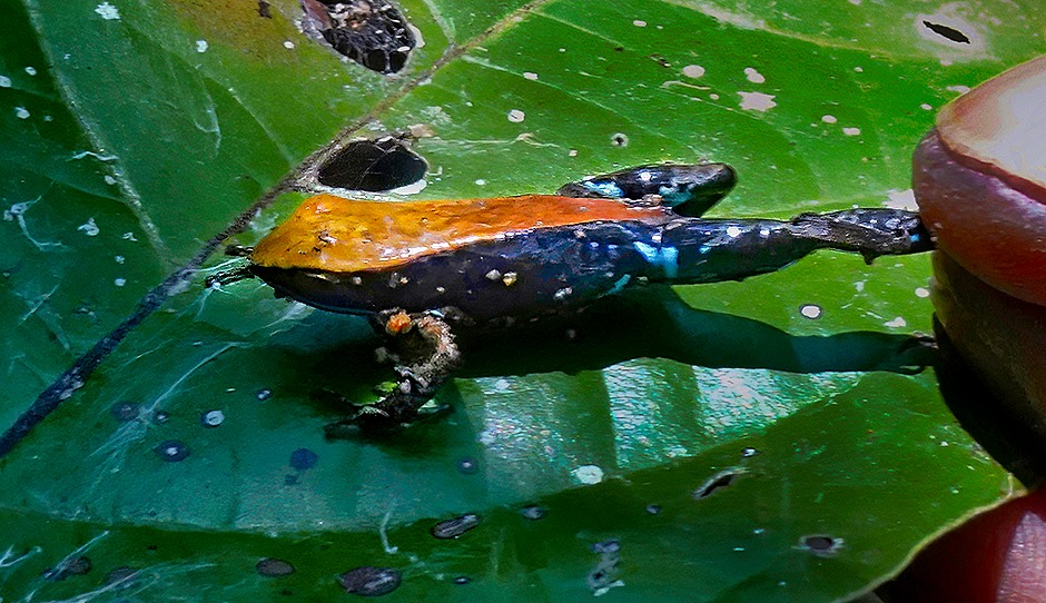 We also saw a very tiny but brightly colored frog that one of out guides found and showed us, again on a leaf. We think this was an Orange Backed Mantella, also endemic to northern Madagascar, because of its coloring (scientific name Mantella ebenaui ). The bright coloring apparently deters predators wary of eating poisonous frogs (which these may actually be). It appeared that the only reason it didn’t hop away was the guide’s thumb on one of its back feet.
