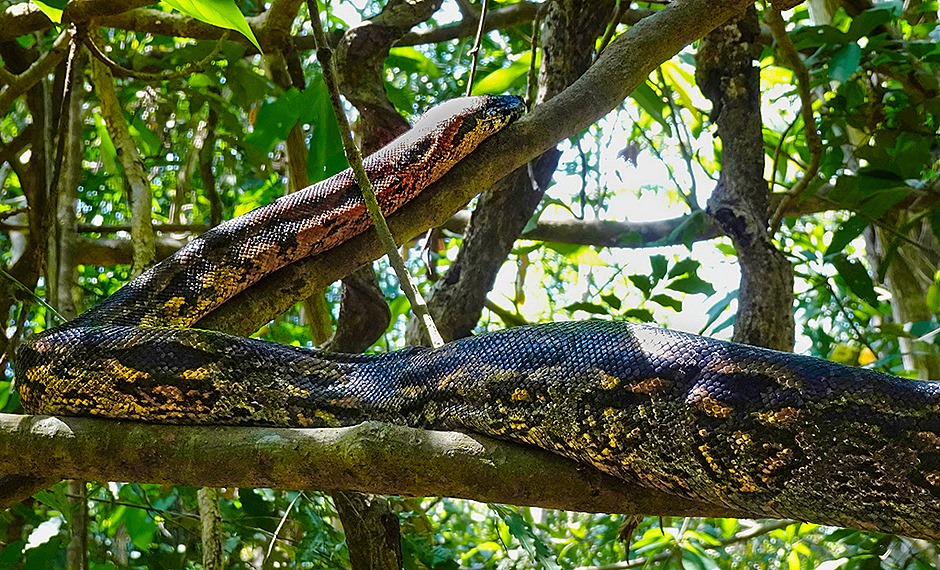 We encountered a boa constrictor, about 5 feet long, entwined on some branches in a tree. Since it was in a tree we think this must be a Madagascar Tree Boa. They live in the trees during the day but hunt on the ground at night.