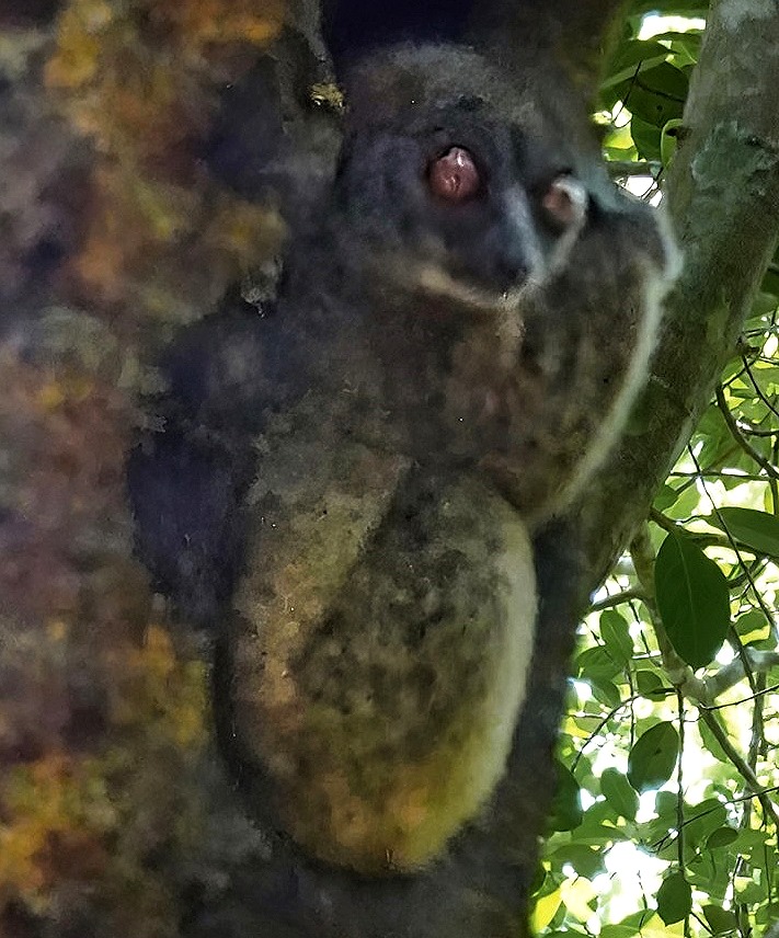 The lemurs we saw here are called Black Lemurs, something of a misnomer because only the males are black. The females are mostly brown to yellow in color with white around their faces. This forest is populated by very tall trees, some 100 feet tall and hundreds of years old. The lemurs were high in the branches and difficult to see from the ground, particularly when hiding behind leaves. We passed a baby lemur hanging onto a tree trunk in heavy shadow. Lemurs have a very intense countenance, with bright unblinking eyes that we understand are caused by reflective tissue in the back of their eyes.