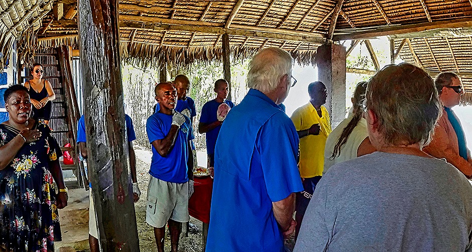 As we neared the village we passed many vendors, mostly of embroidered table cloths, and what looked like a farm. We had to wait in the village for more than an hour for our lunch to be prepared because it apparently wasn’t started until we got back. What, didn’t they think we would make it back? The buffet of local food was eventually set out and was pretty good. Some of the guides and villagers sang for us, including their national anthem, in the thatched lunch hut.