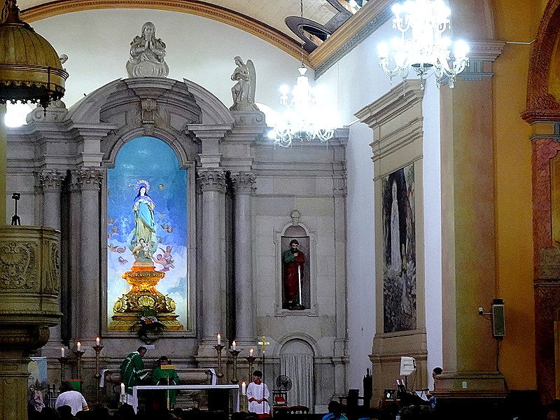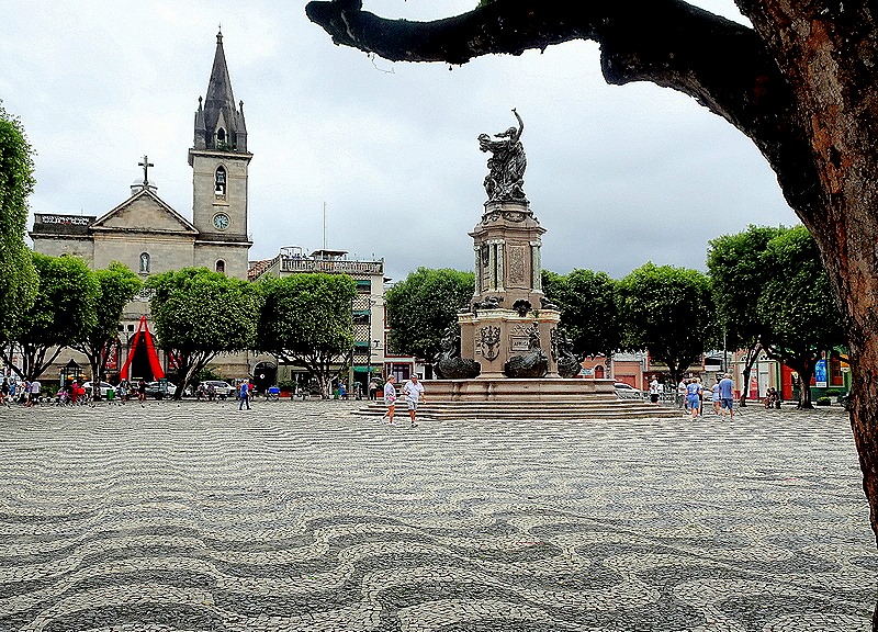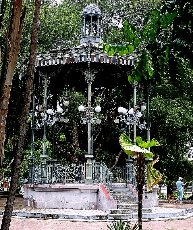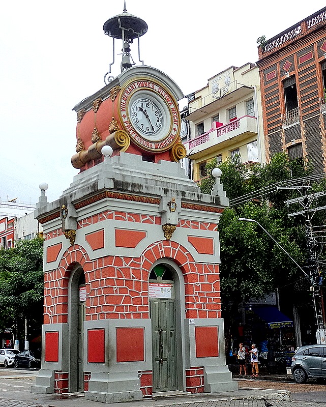 This time we had only one day and decided to spend it walking through the city seeing the sights we had missed before. Our first stop was the Municipal Cathedral, first built in 1695. It was Sunday so Mass was in progress but we were permitted to come in and sit in the back seats. The people were not dressed up for the most part, but a little dog with its hair made up for a Sunday visit came in with its mistress and sat in front of us. The church was set in a large green park and in the street next to it was the Relógio Municipal de Manaus (sounds much grander than “Municipal Clock Tower,” doesn’t it).