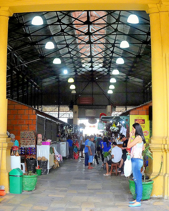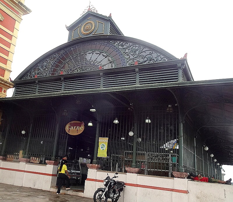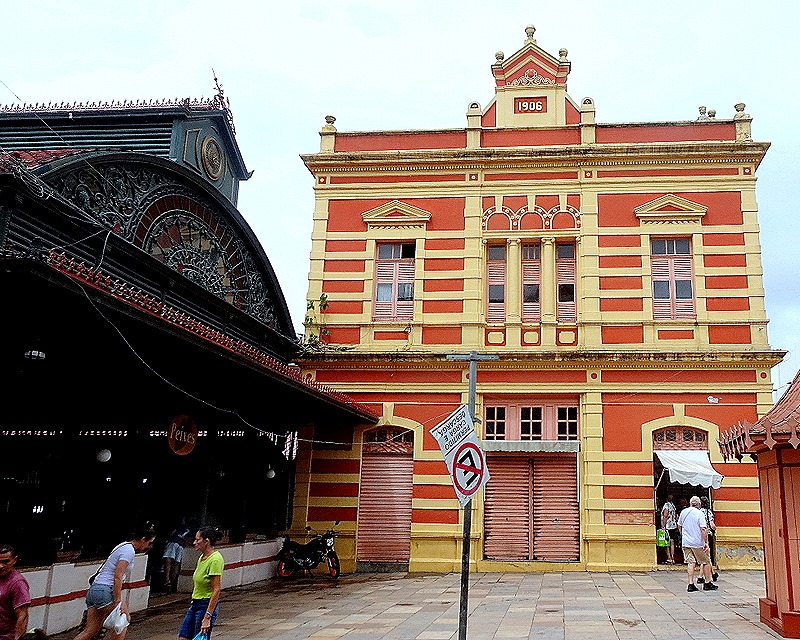 One place we had not been able to walk through when we were here before was the Mercado Municipal Adolfo Lisboa. The masonry portion of this large market was opened in 1883 and the additional iron Art Nouveau structures opened about 30 years later. All of the materials for these buildings were prefabricated in Europe and shipped up the Amazon to Manaus. The market is supposed to have been modeled on Les Halles in Paris. We entered the tourist market building through the masonry facade on one of the streets running up from the river.
