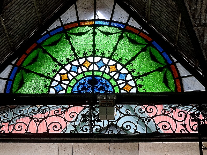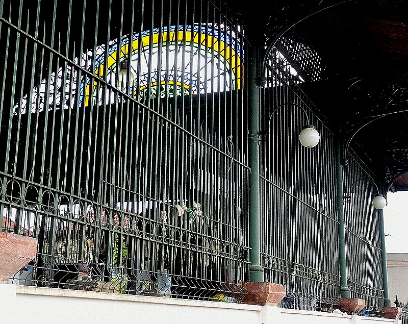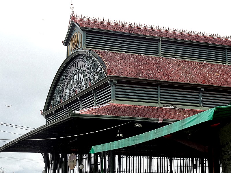 Running parallel to the river are several long iron buildings that house produce, meat and fish markets. Under the roof in each end wall is a large stained glass window. The complex has restaurants, iron gates, flowers and bushes aplenty.