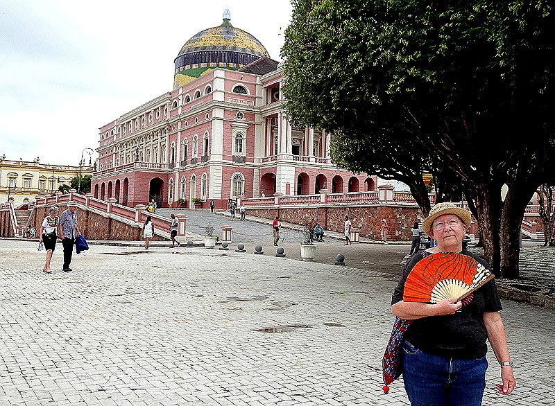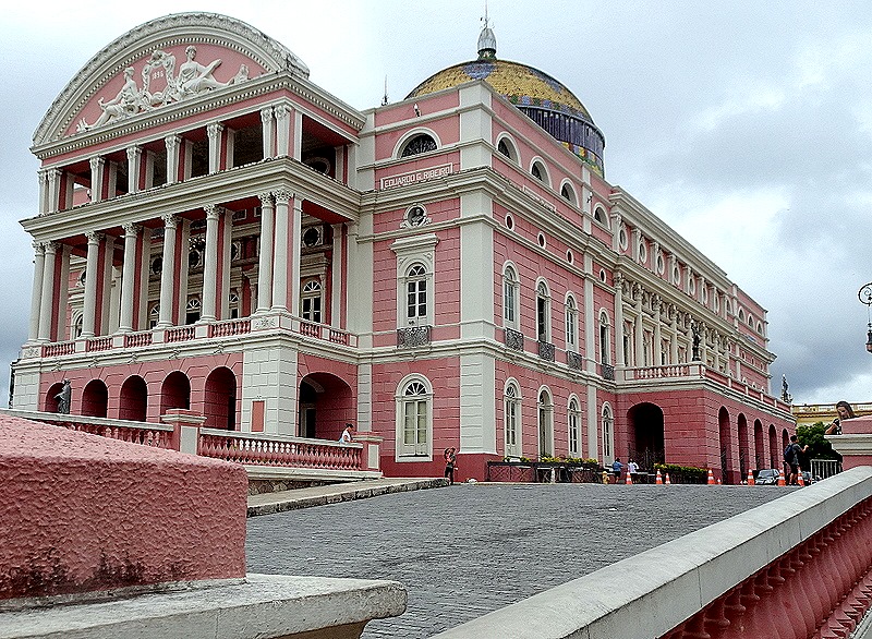 We finally arrived at the Teatro Amazonas, a large pink building with a dome tiled in the colors of the Brazilian flag. Opened in 1896, it was financed by the huge fortunes accumulated by the rubber barons during the period when this part of Brazil had a world monopoly on rubber, just as the auto industry was beginning to need large amounts of it. Everything here, from tiles to marble for the stairs and columns, to the 32 Murano chandeliers, was made in Europe and shipped up the Amazon by boat. This imposing building, which would have looked more at home in a large European city, must have been quite a sight when it was opened here in the middle of a rainforest!