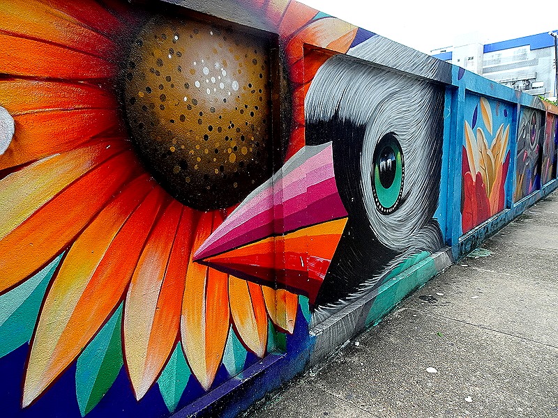 We had toured the Teatro Amazonas, the opera house that is the city’s most famous building, on both of our prior visits, so we didn’t need to do that again. But we decided to walk up there again because Mary wanted to get an opera house T-shirt. We walked up a couple of very long blocks lined on both sides with closed up vendors’ carts; it was a bit eerie because almost no one else was in this street that looked like it would be very busy on any day but Sunday. We walked past a very large mural of an indigenous woman covering the side of a multi-story building and then through a park with an iron pavilion, some dry ponds and a good bit of nice flora. Again, hardly anybody there other than us on a Sunday.