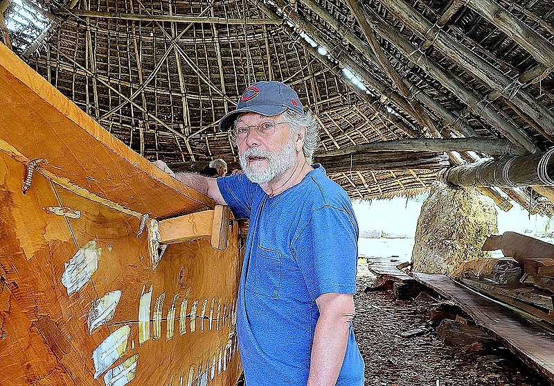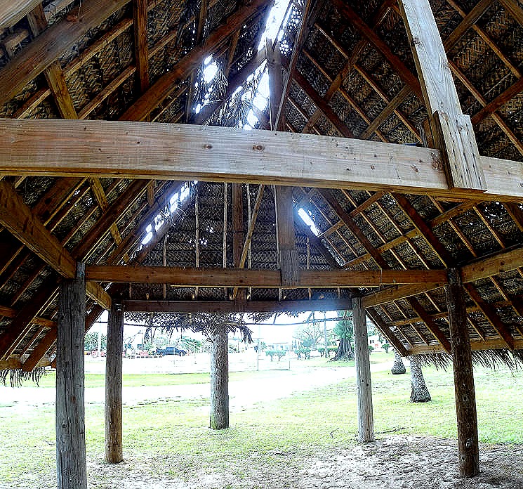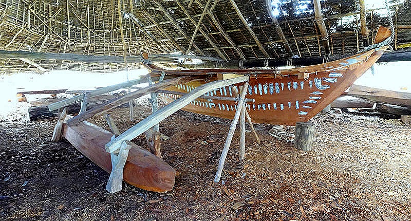 We walked up the beach a little way, passing some traditional open, thatched roof buildings. In one of them was a large outrigger canoe under construction. This was part of a project to create traditional craft and revive the art of Pacific celestial navigation that for hundreds of years had enabled Polynesians and Micronesians to travel between distant islands. The building is called a boat house & itself took months to build using traditional techniques. One of Walt’s assistants, who had been a participant in the project, spoke to us about the canoe under construction and the project.