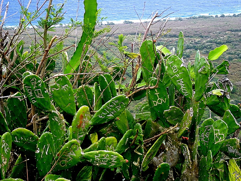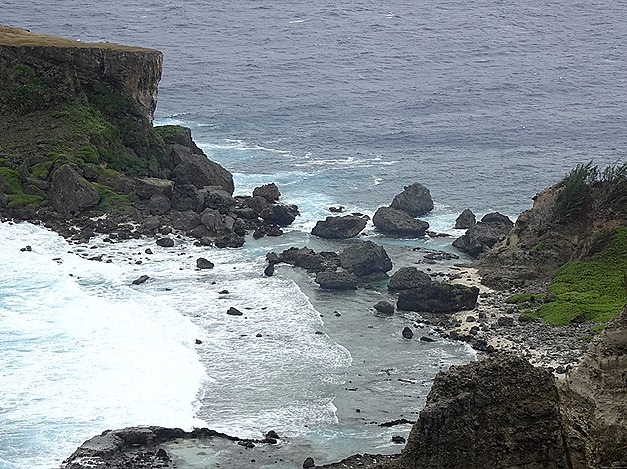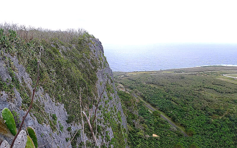 As you can see from the last picture above, Suicide Cliff is very high above Banzai Cliff. From there you can look down not only on Banzai Cliff, but also on the little that remains of a Japanese air field called Marpi Point Field. Actually, the air field was uncompleted when the battle of Saipan ended and the Americans completed building it and used the airfield for some time. Walt gave us a talk about Suicide Cliff when we arrived below at Banzai Cliff. The edge of the mountain cliff has cactus that has been carved with graffiti; it was a disquieting view over the edge to the land far below.
