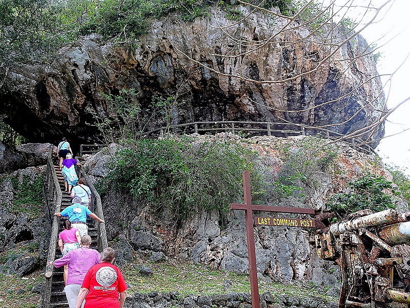 The northern mountain region also contains what is called the Last Japanese Command Post. It is a fortified cave built into the wall of a cliff, with old Japanese artillery and tanks arrayed on the ground in front. There was a wooden stairway to reach the cave or you could climb up over a few boulders. We have read that this is where General Saito, the top commander on Saipan, committed suicide after sending an order that all soldiers fight to the death.
